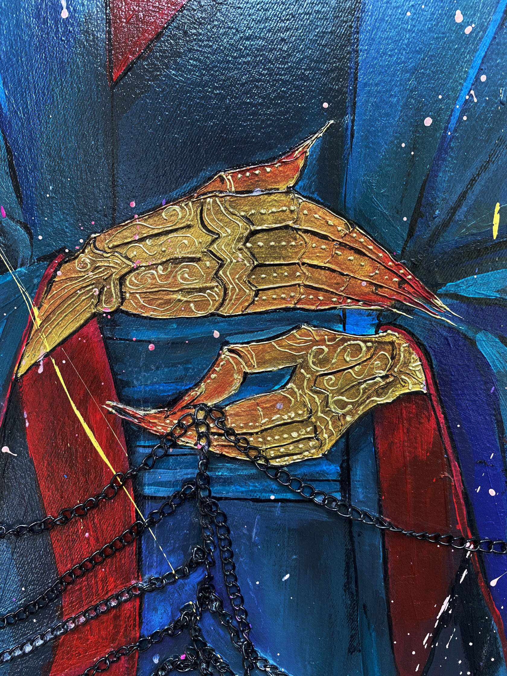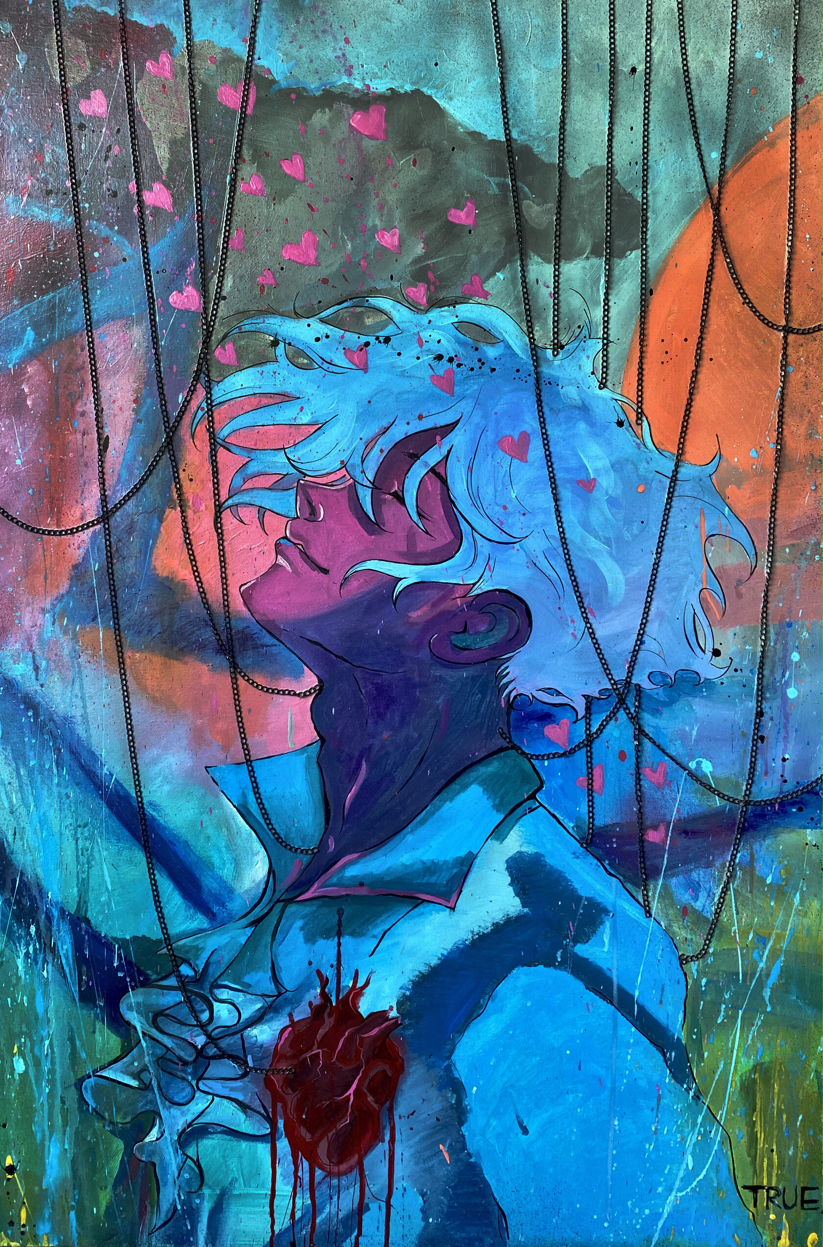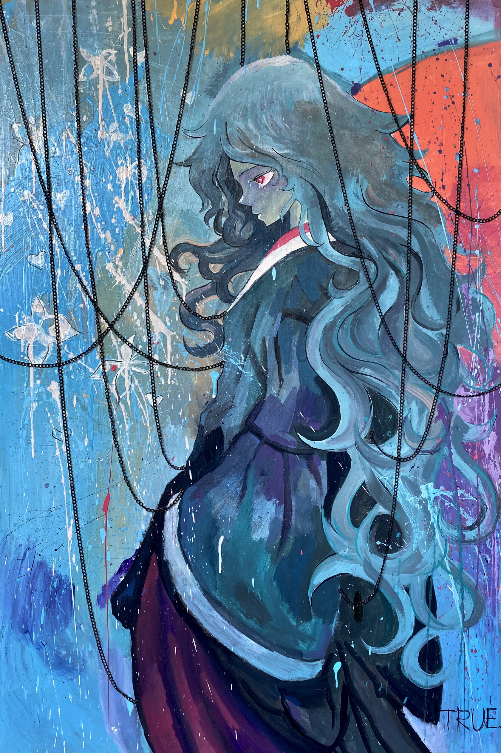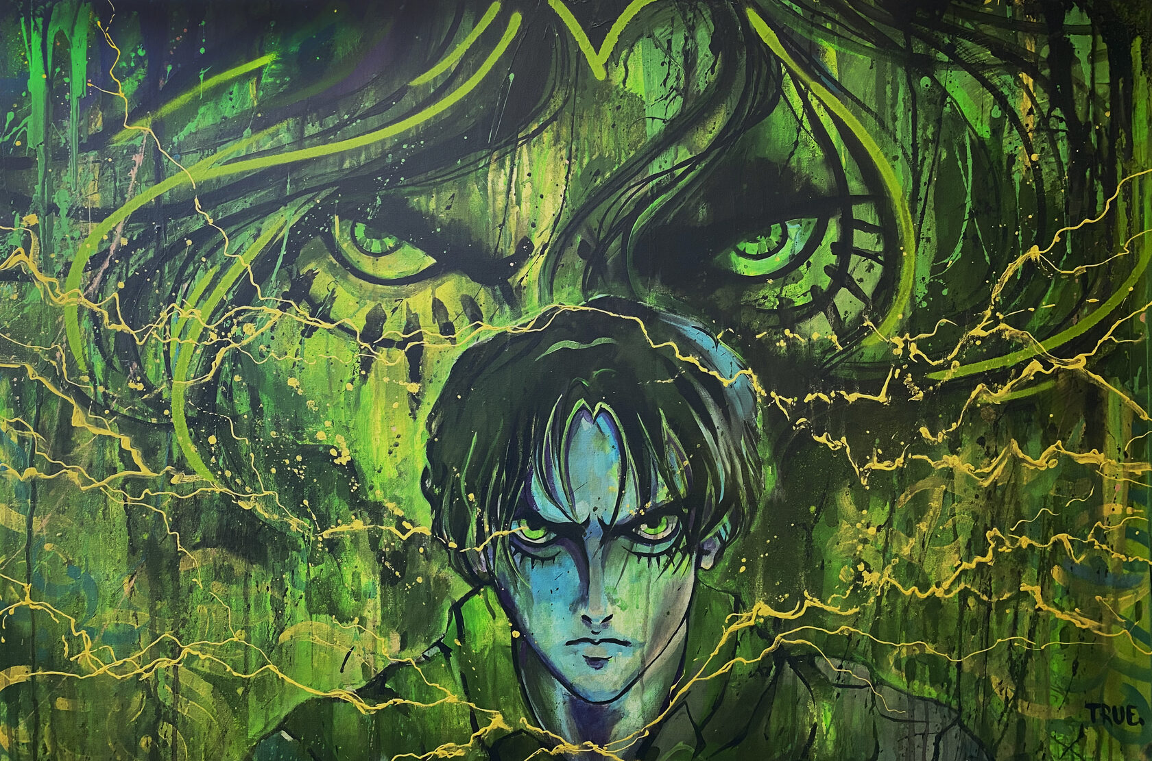Финальная часть триптиха посвященного жизненному пути главного героя Атаки Титанов Эрена Йегера. Триптих исполнен в яркой желто-зеленой гамме с вкраплением неона который проявляется в холодном LED освещении вызывая внутреннее свечение картины.