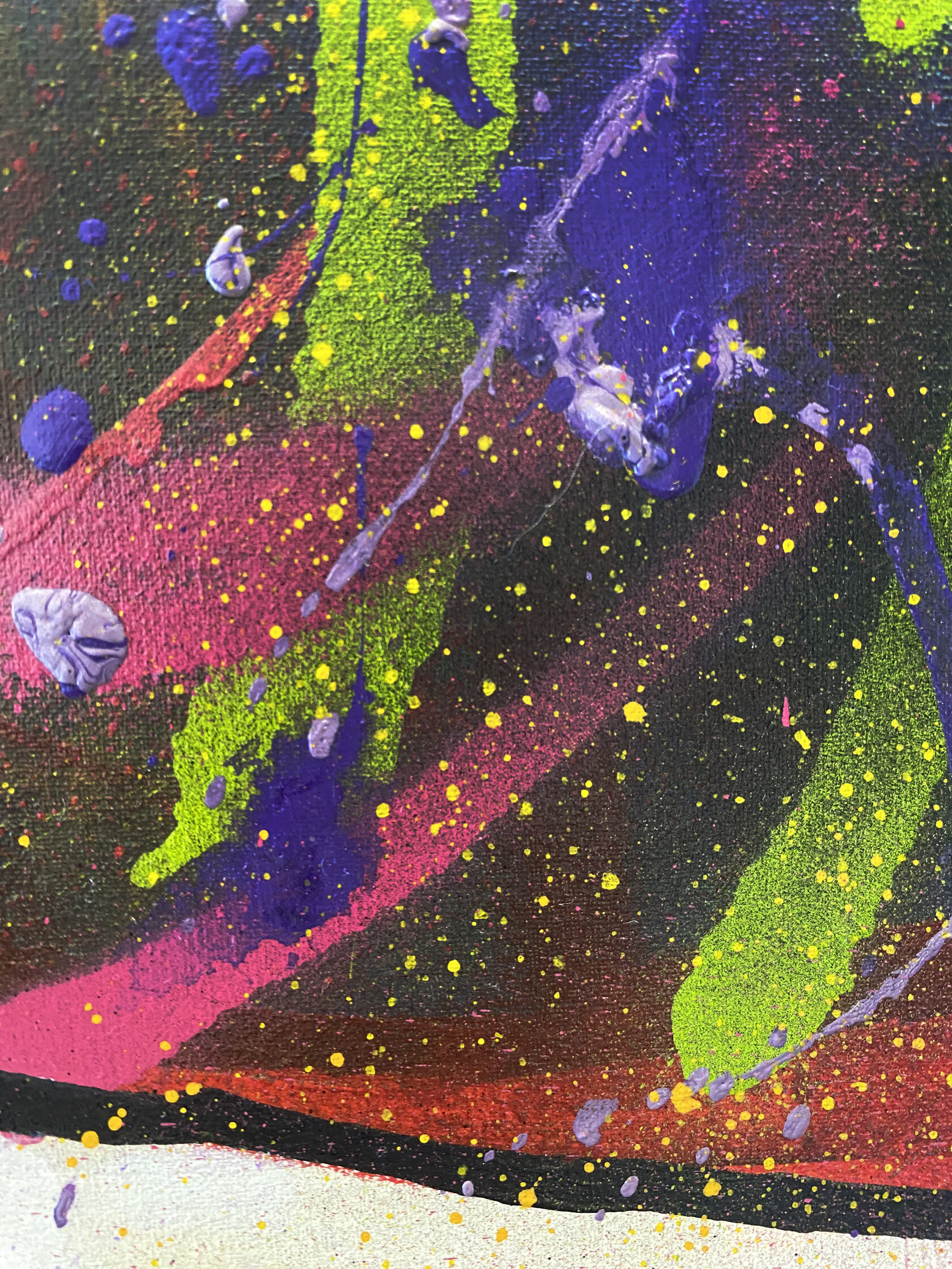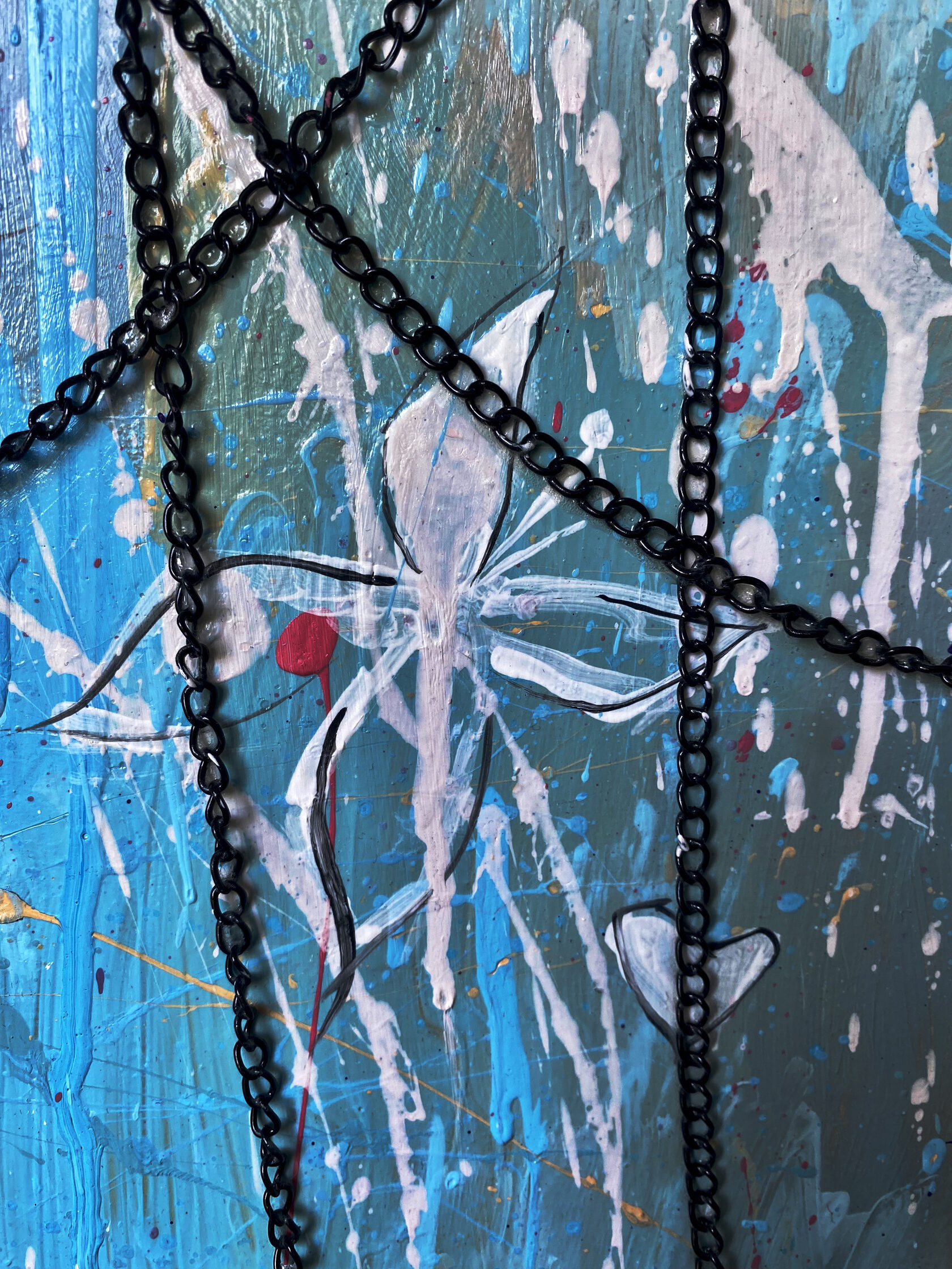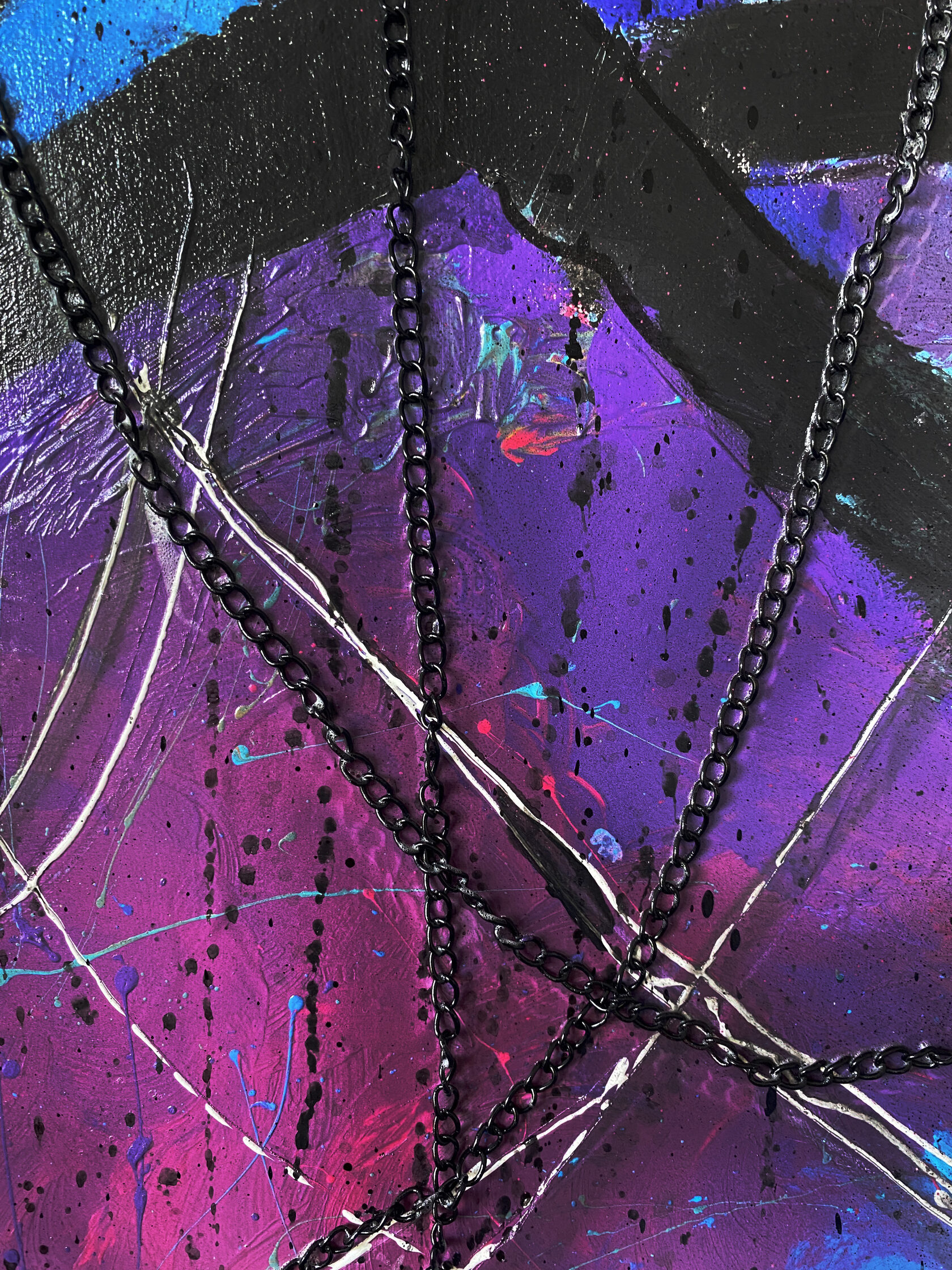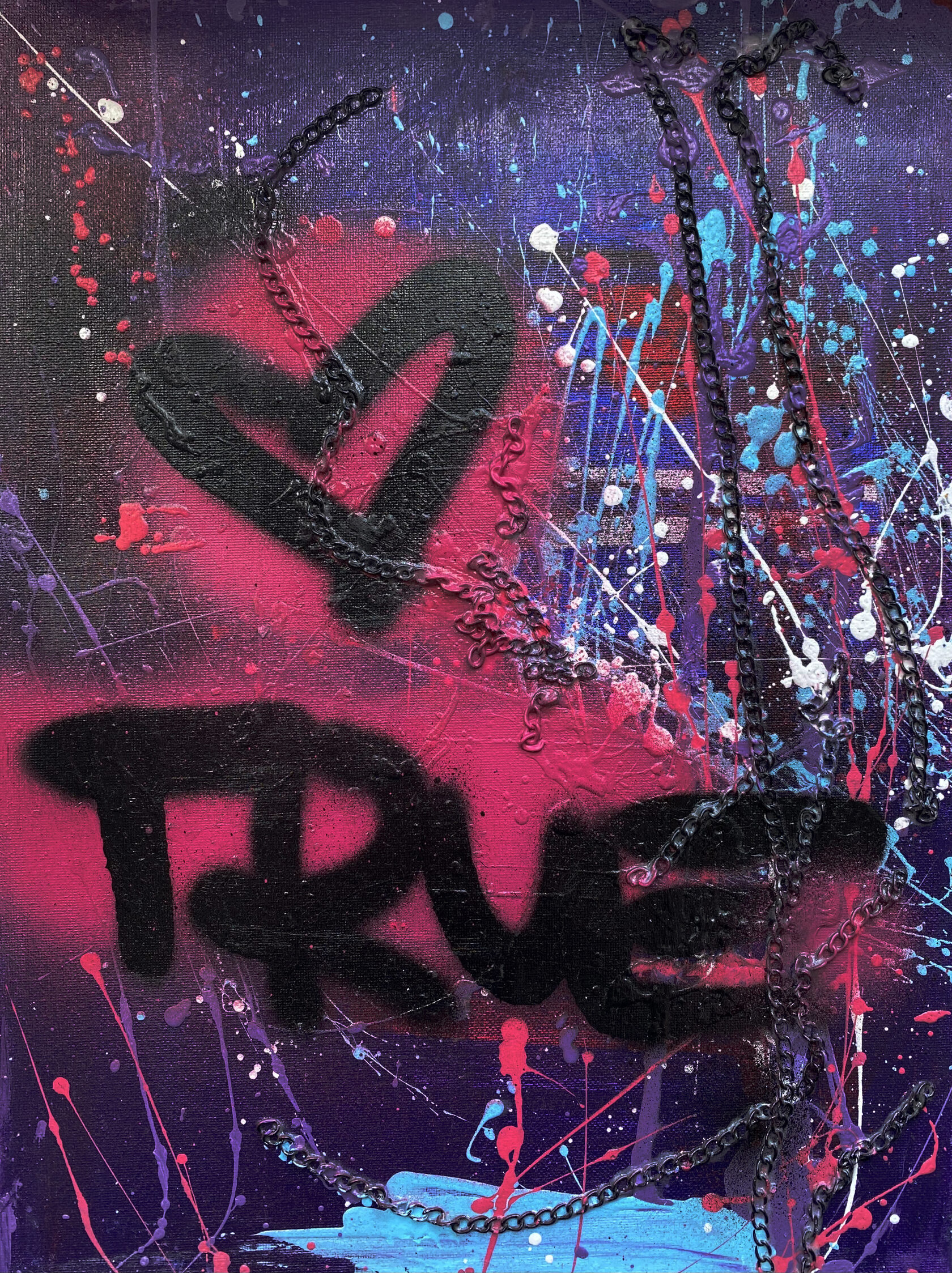 У триптиха "Свободы не существует" есть одна особенность под синим LED освещением открывается новая визуальная грань, не видимая при обычном свете. Полотна начинают "светиться" неоновым светом