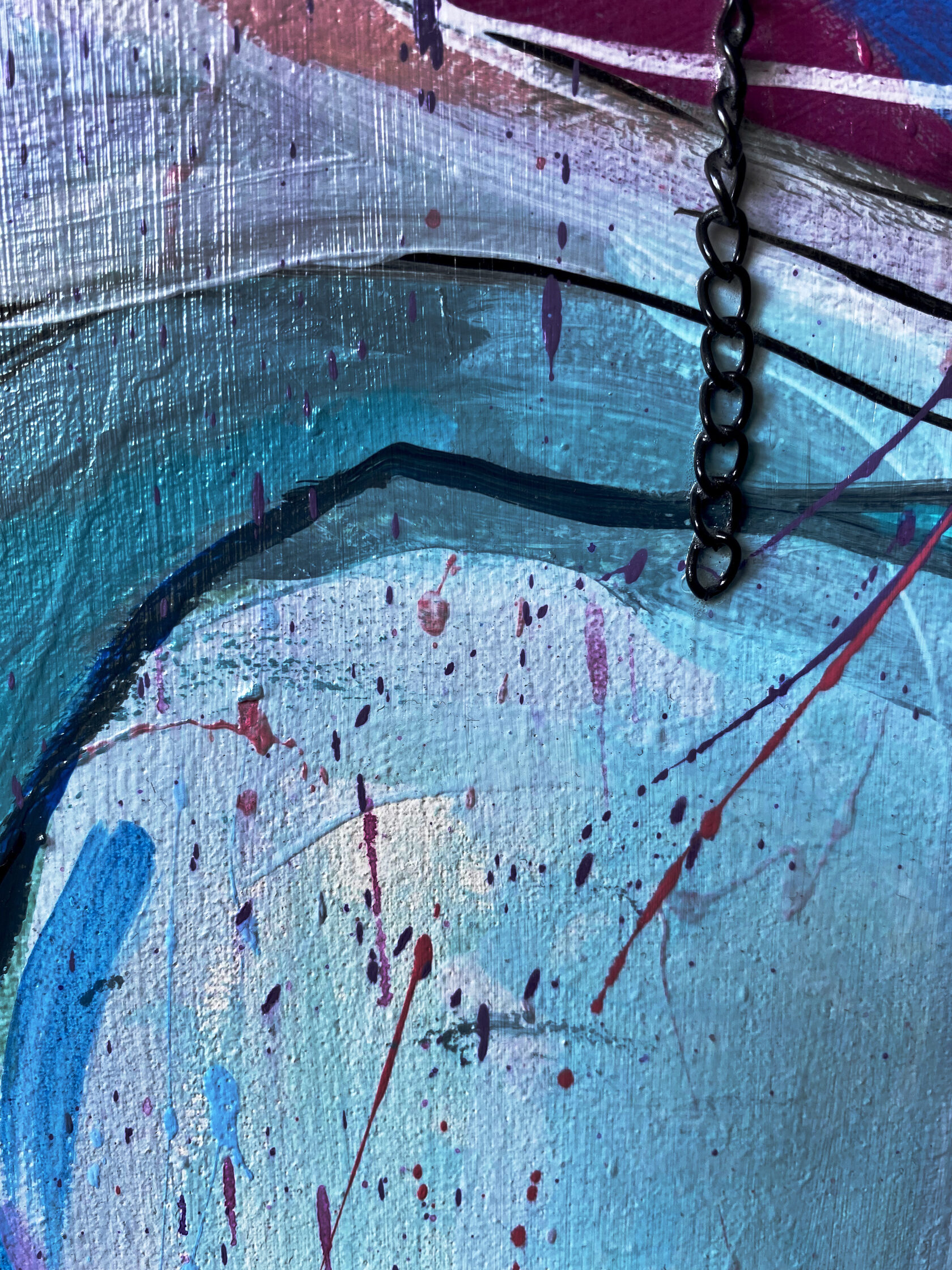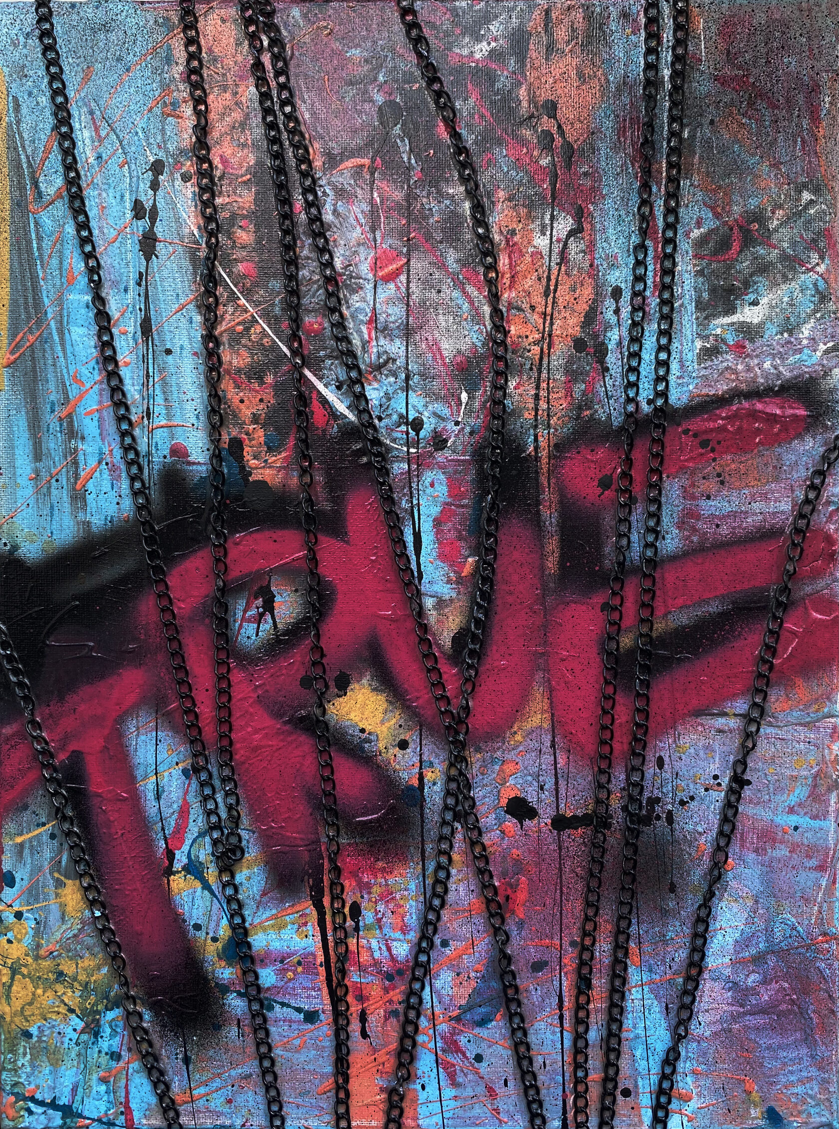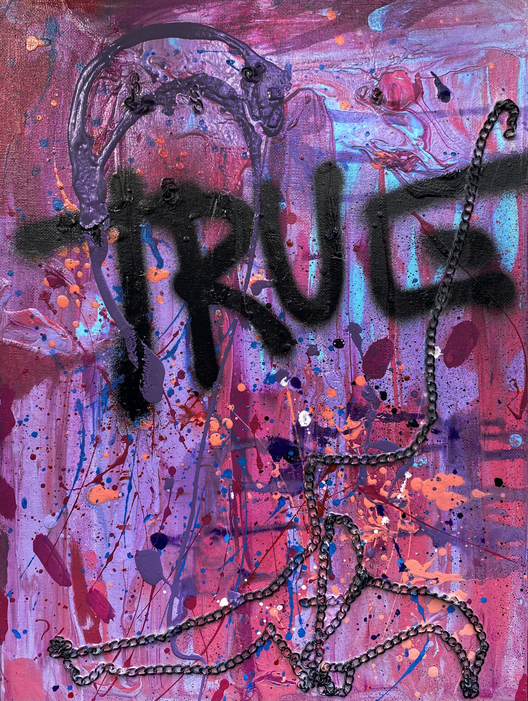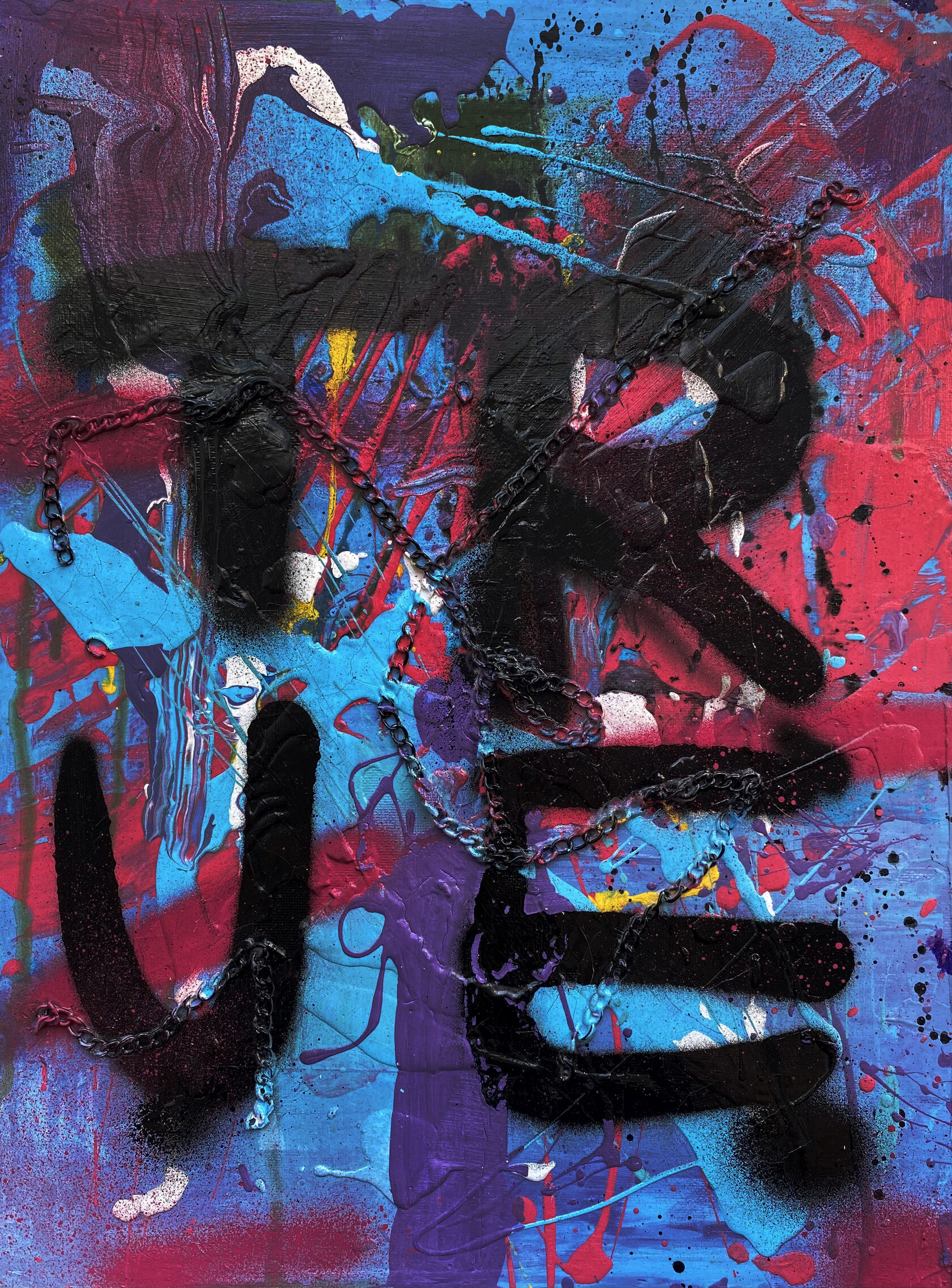У триптиха "Свободы не существует" есть одна особенность под синим LED освещением открывается новая визуальная грань, не видимая при обычном свете. Полотна начинают "светиться" неоновым светом