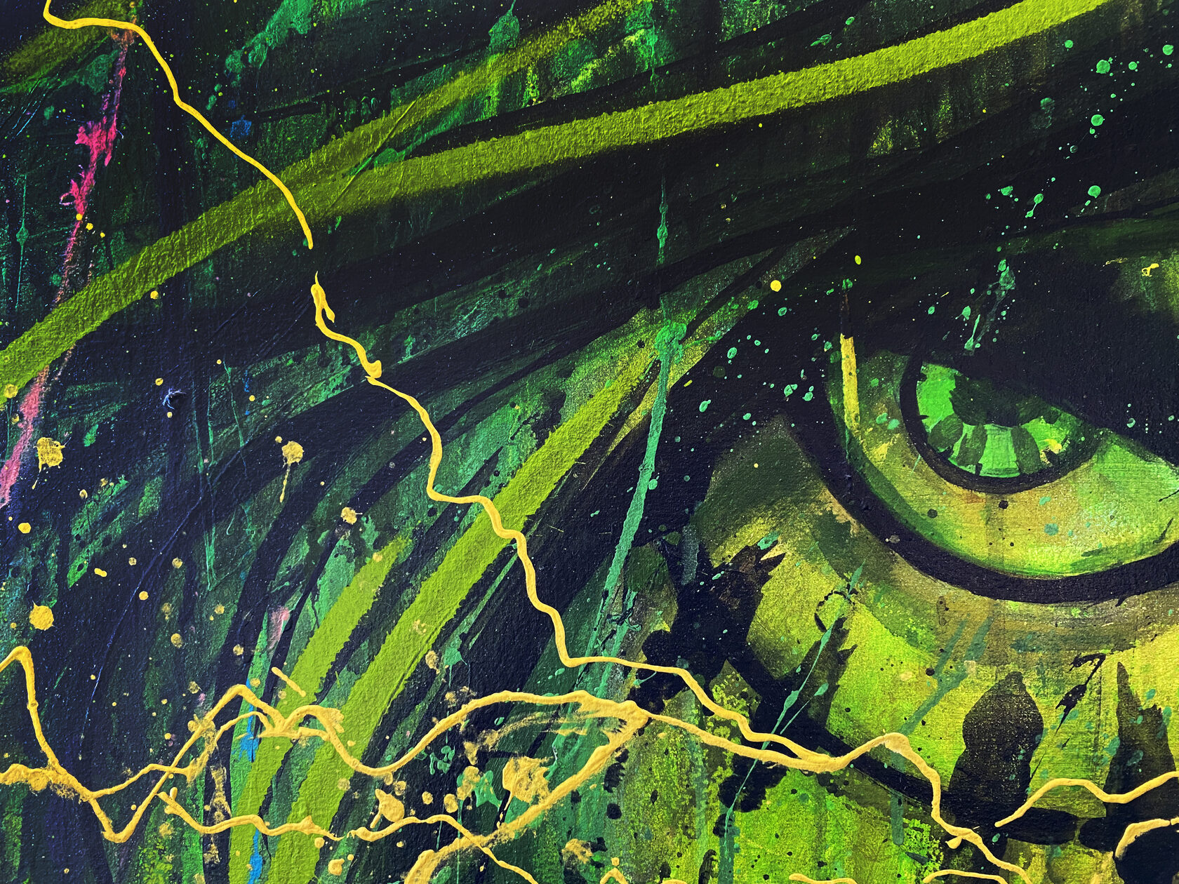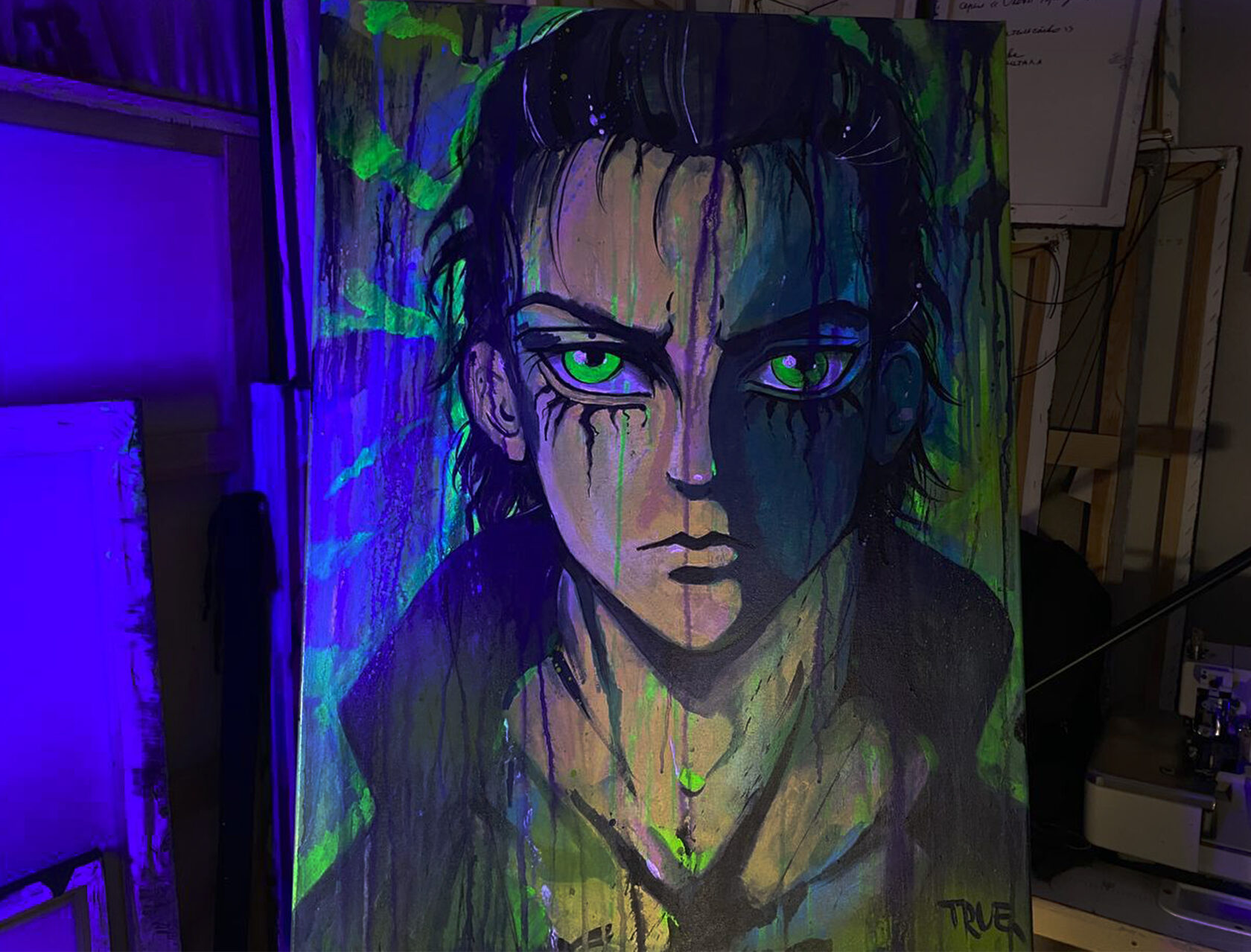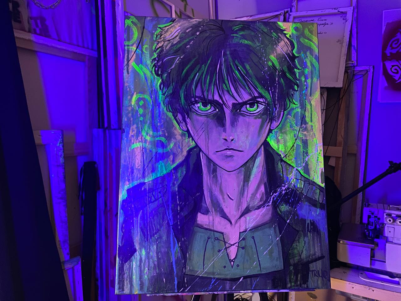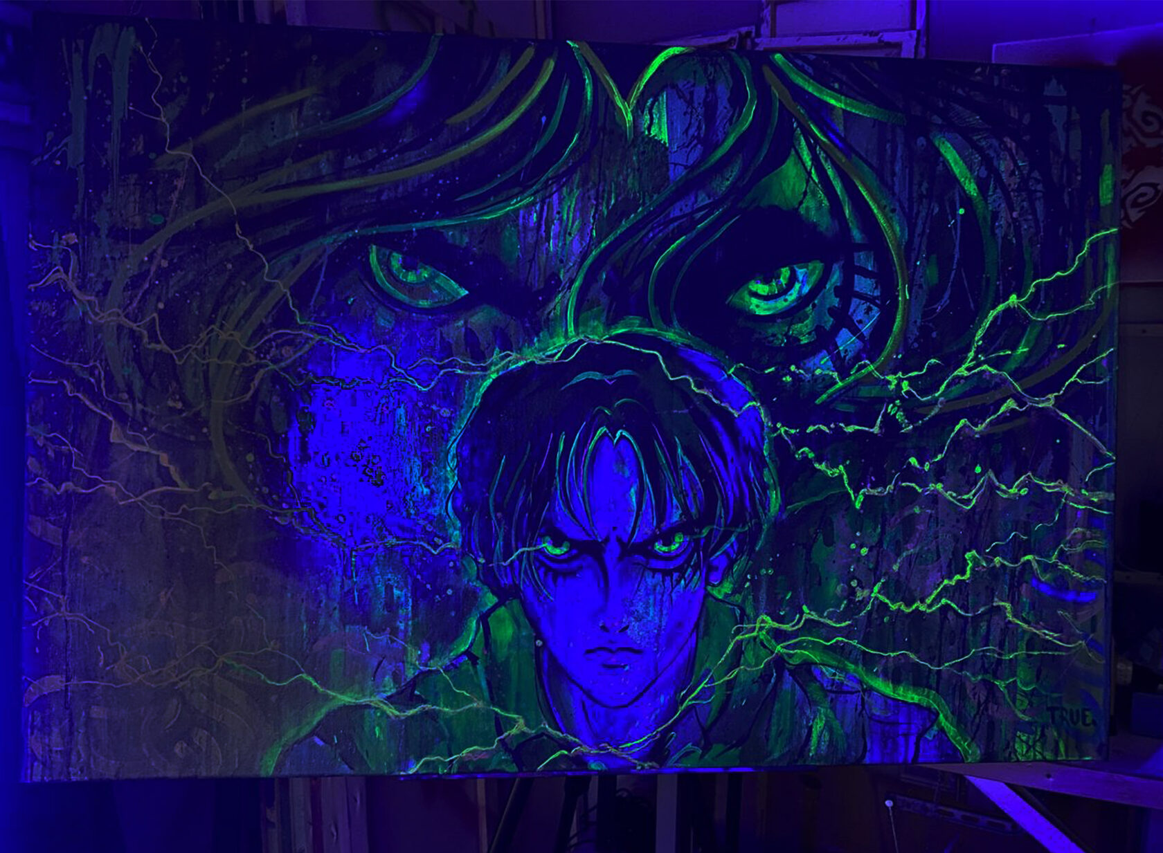 Центральная часть триптиха посвященного жизненному пути главного героя Атаки Титанов Эрена Йегера. Триптих исполнен в яркой желто-зеленой гамме с вкраплением неона который проявляется в холодном LED освещении вызывая внутреннее свечение картины.