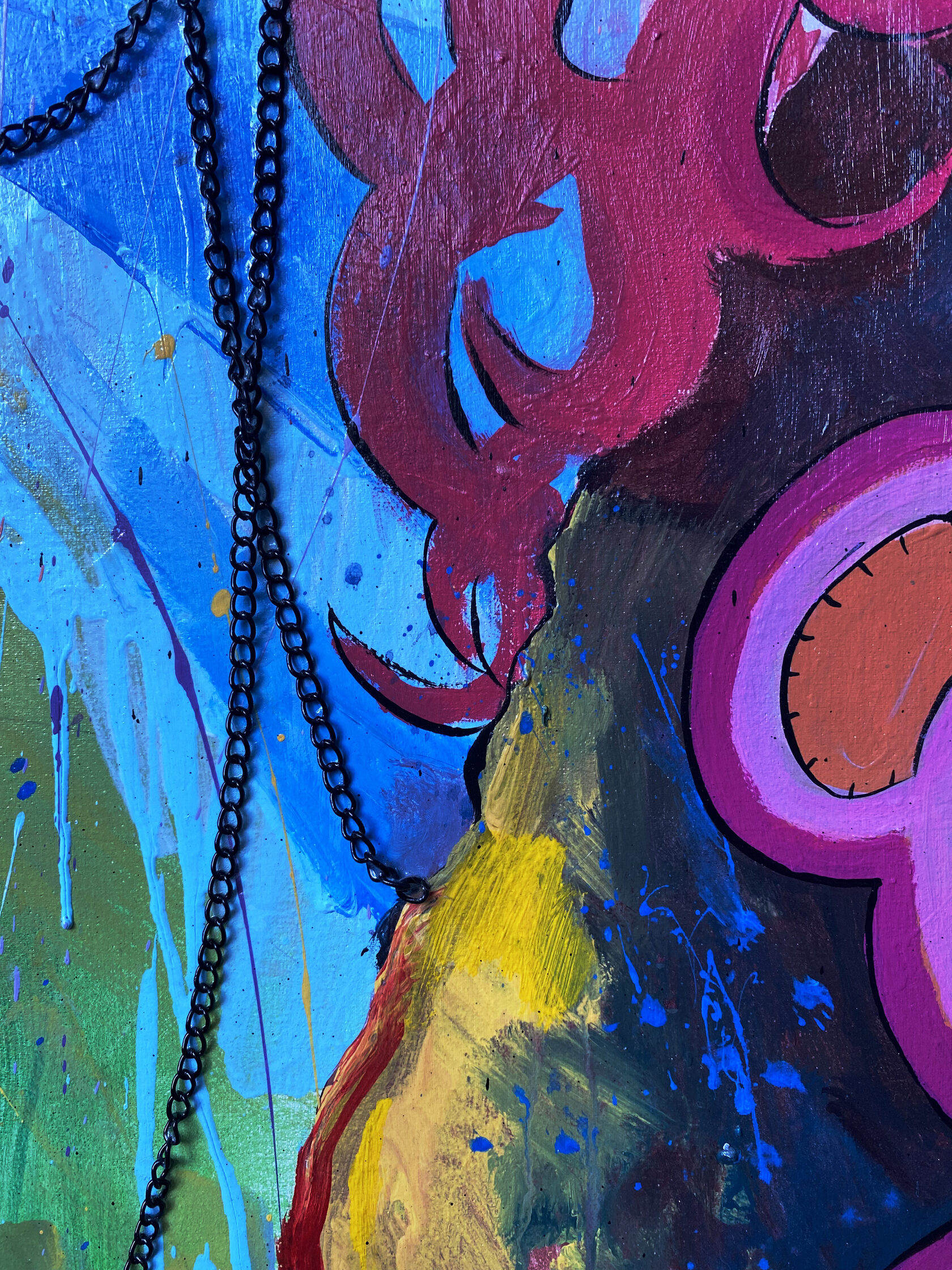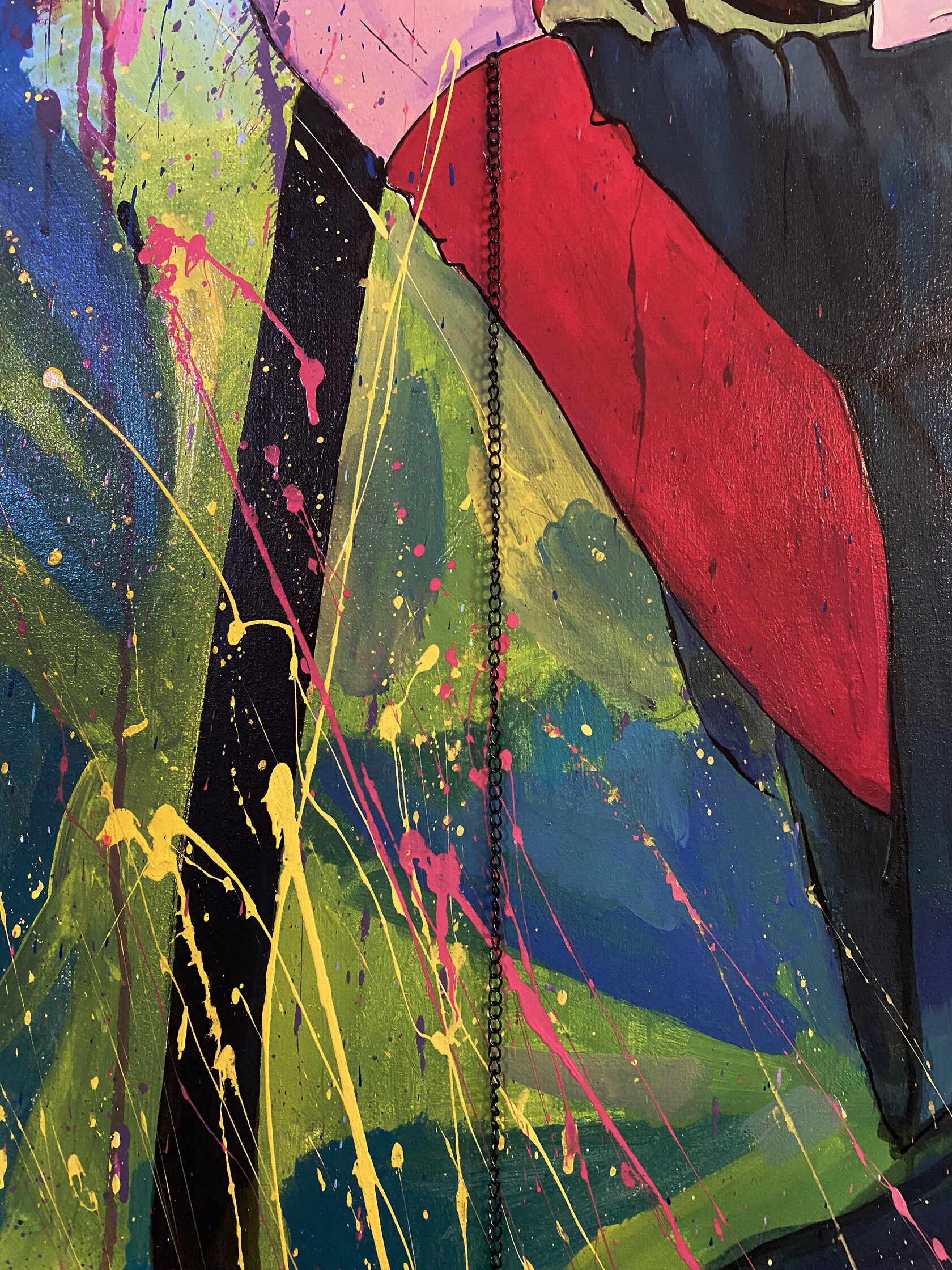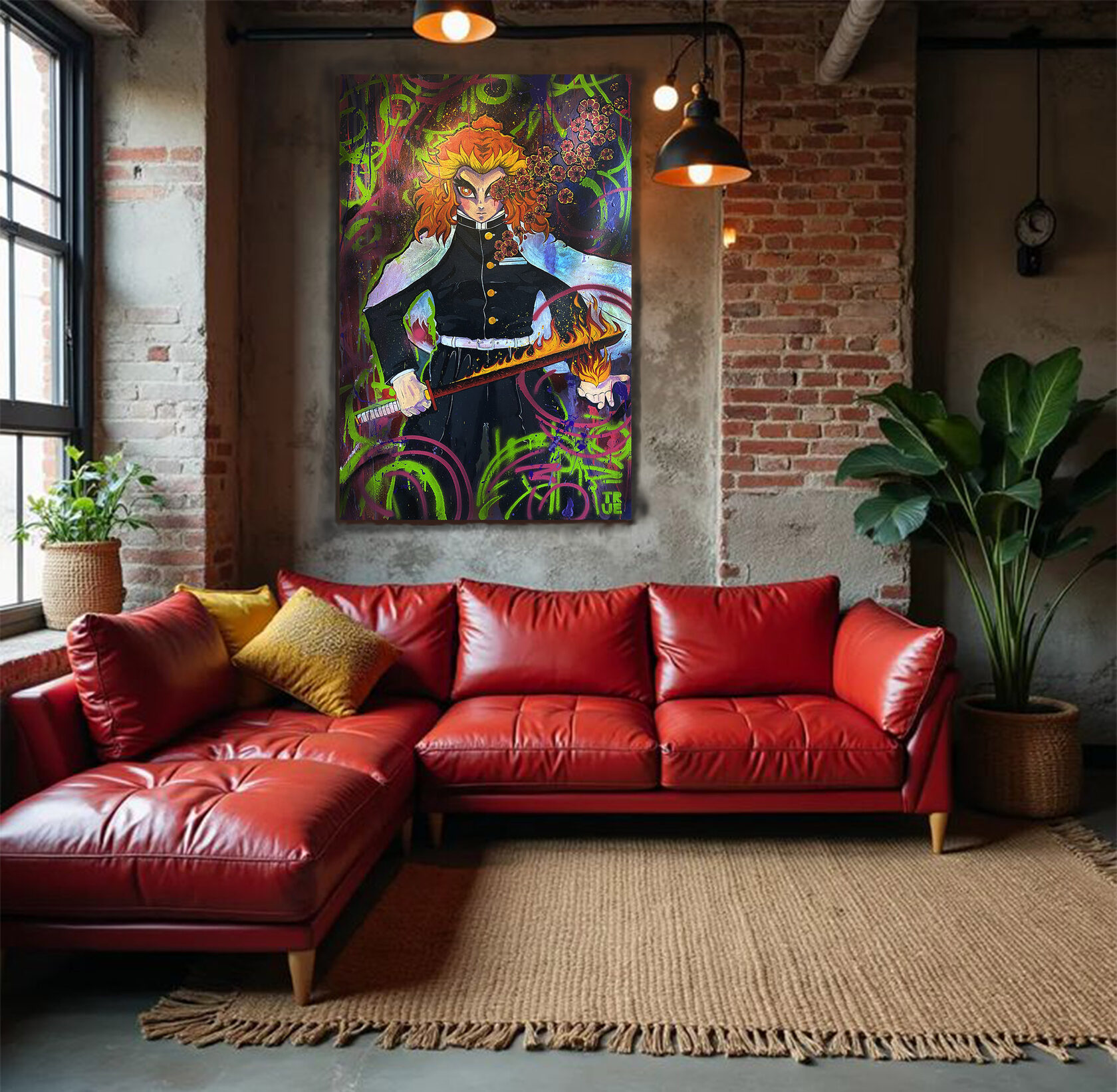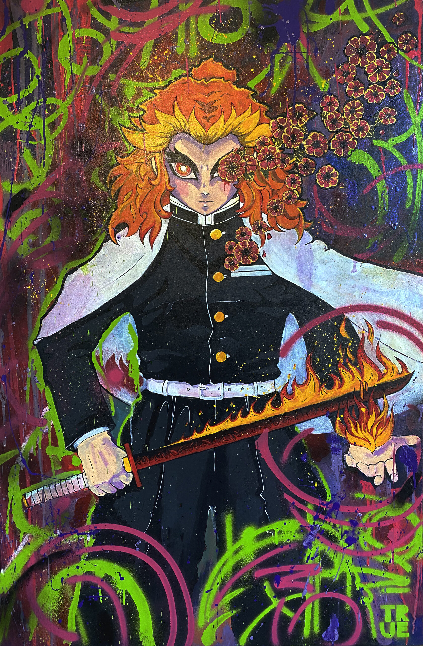 Центральная часть триптиха посвященного жизненному пути главного героя Атаки Титанов Эрена Йегера. Триптих исполнен в яркой желто-зеленой гамме с вкраплением неона который проявляется в холодном LED освещении вызывая внутреннее свечение картины.