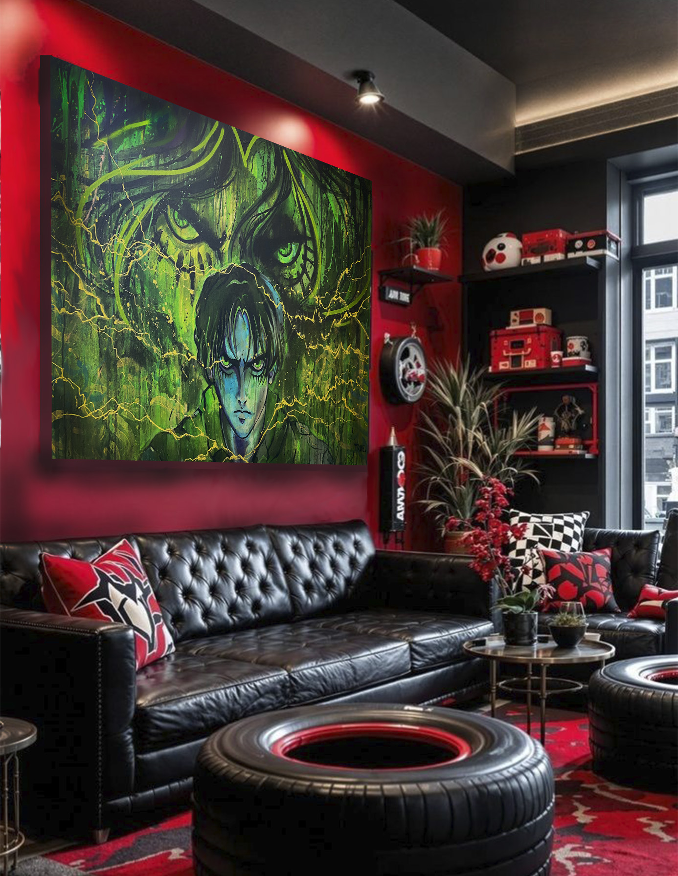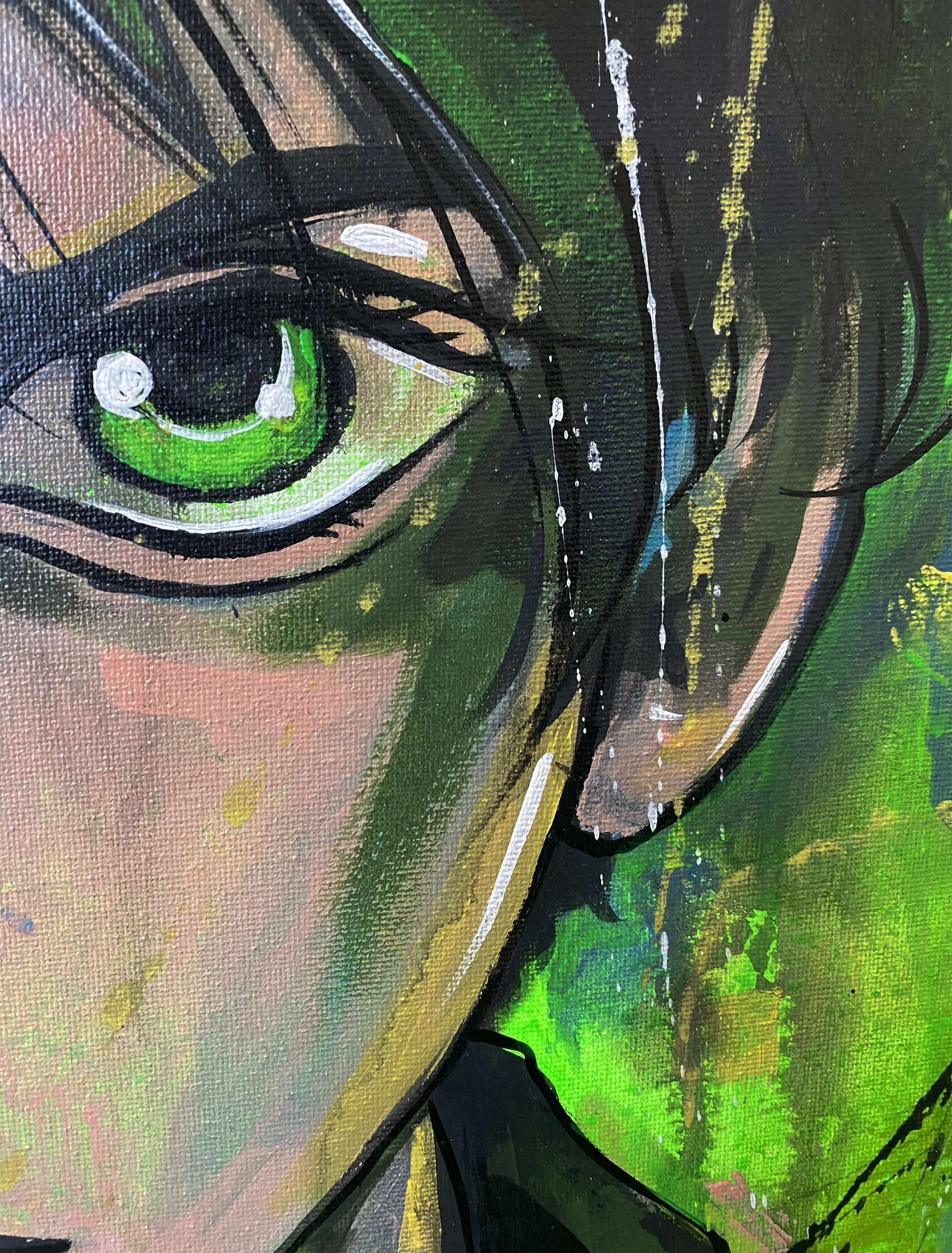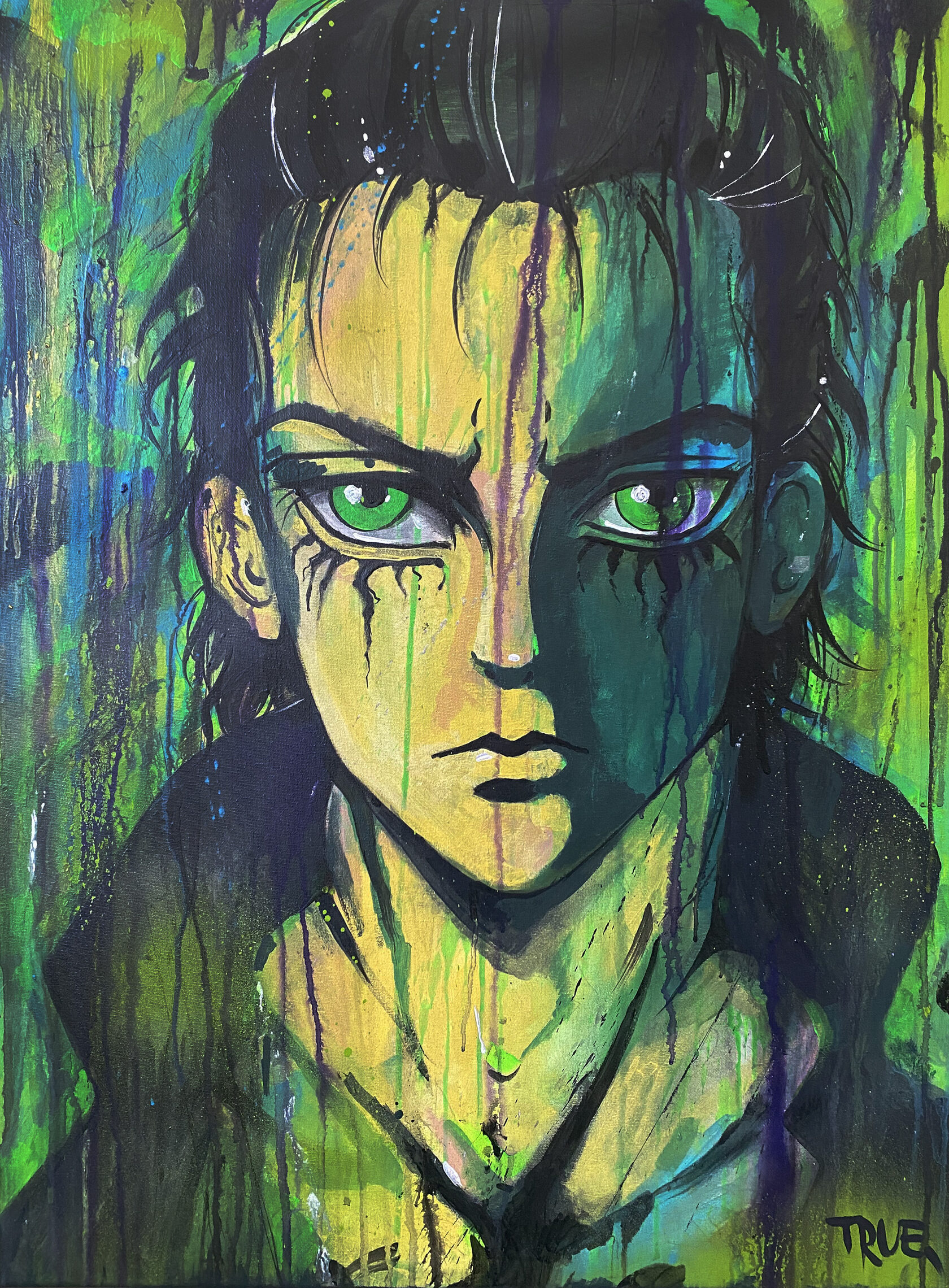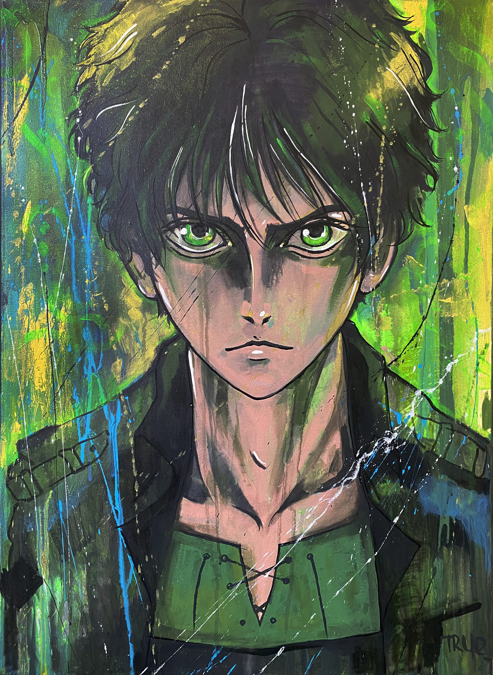 Первая часть триптиха посвященного жизненному пути главного героя Атаки Титанов Эрена Йегера. Триптих исполнен в яркой желто-зеленой гамме с вкраплением неона который проявляется в холодном LED освещении вызывая внутреннее свечение картины.